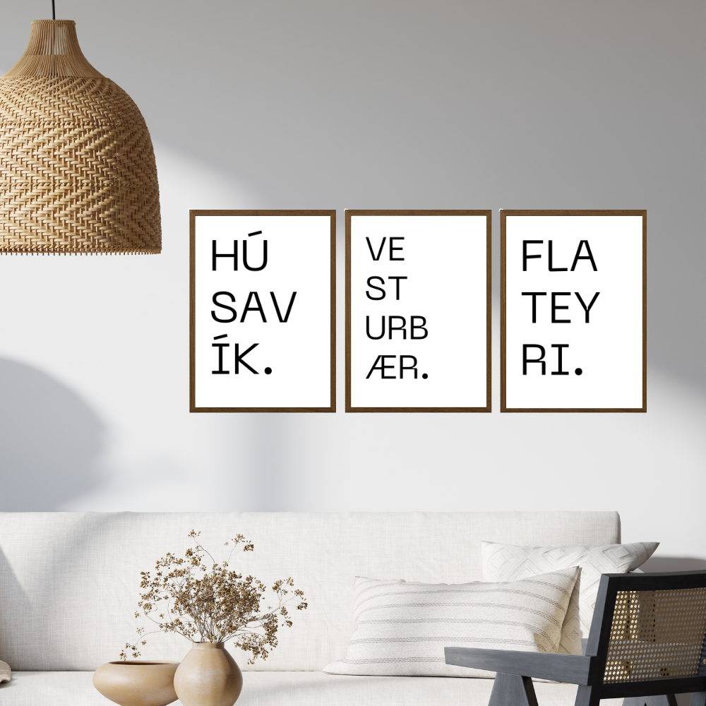 Það kemur vel út á veggnum að setja tvö eða fleiri bæjarheiti á heimilið. Til dæmis ef annar aðili er frá Ísafirði og hinn frá Hveragerði og þið búið saman í Hafnarfirði.