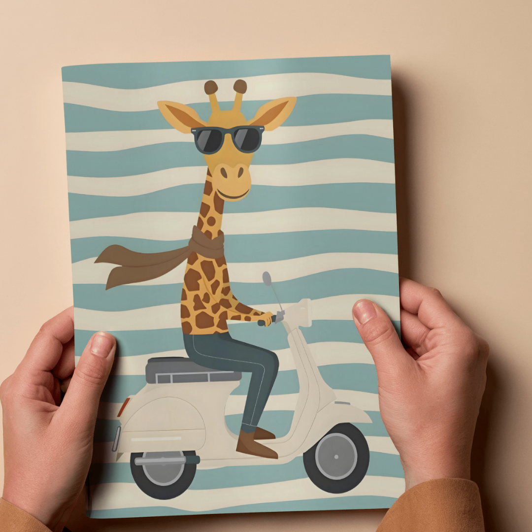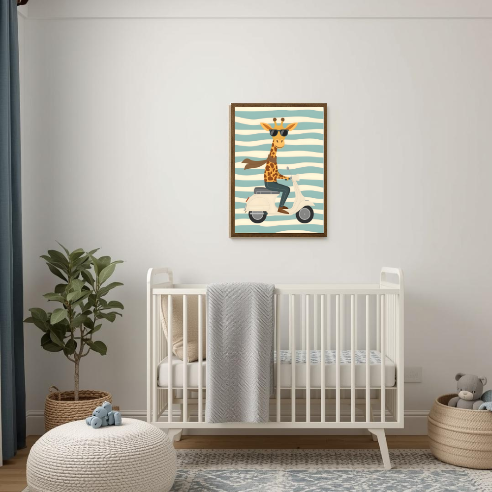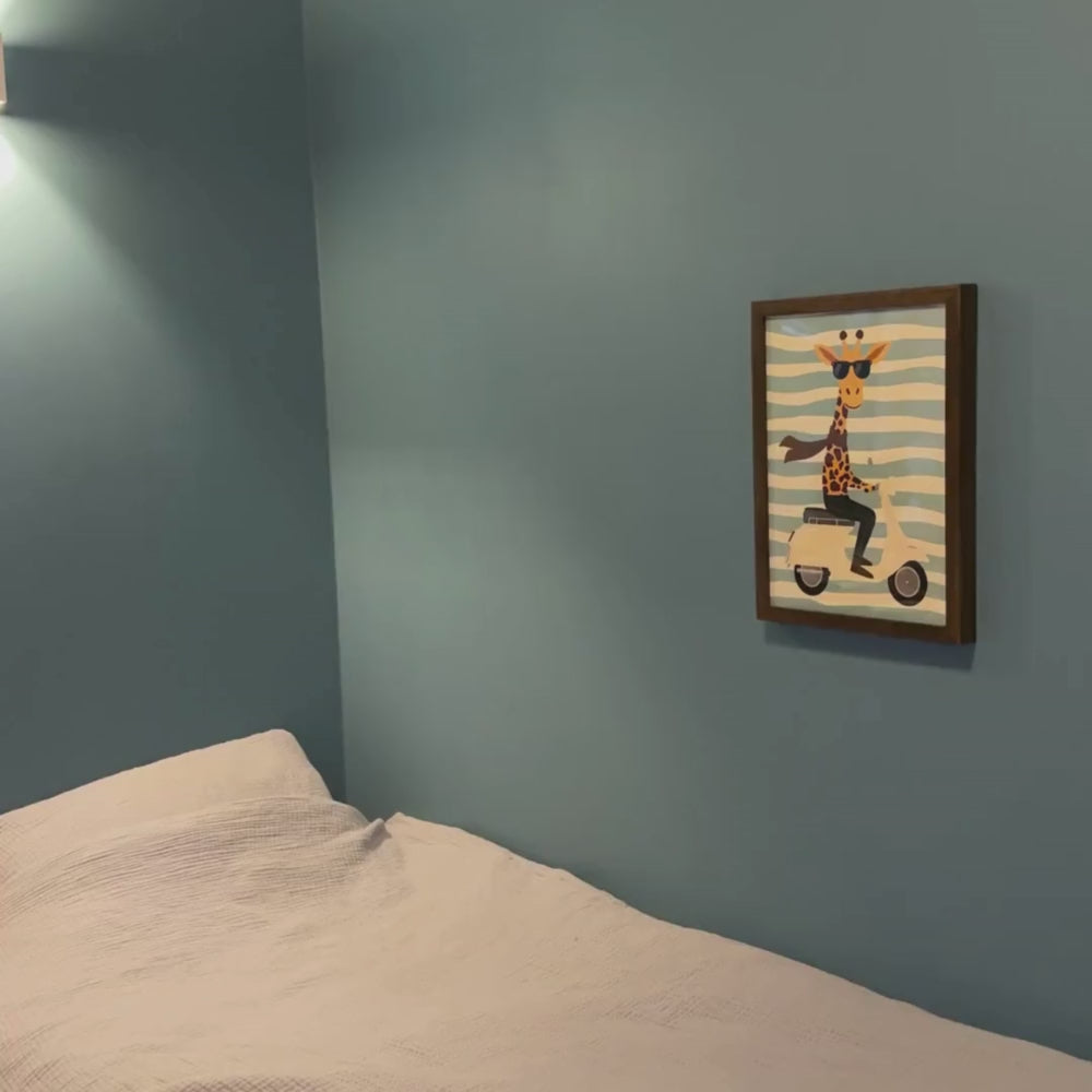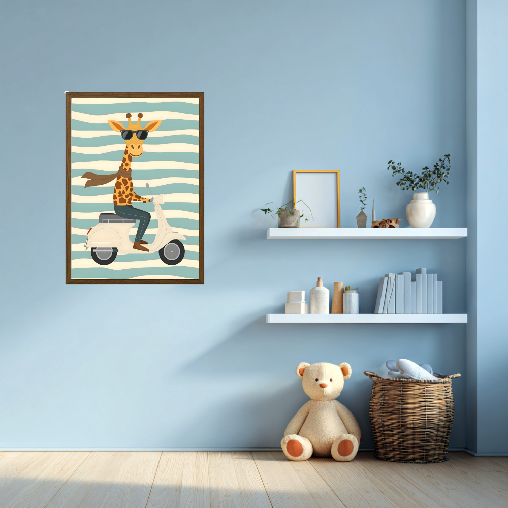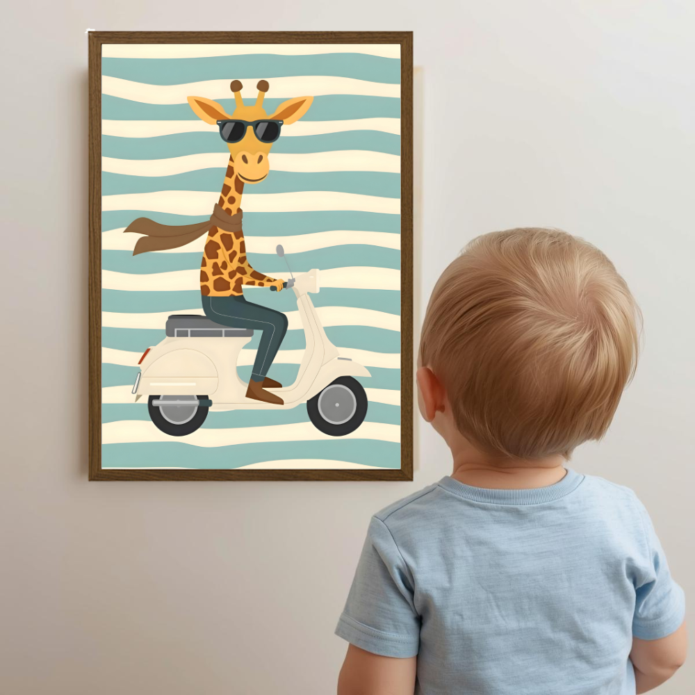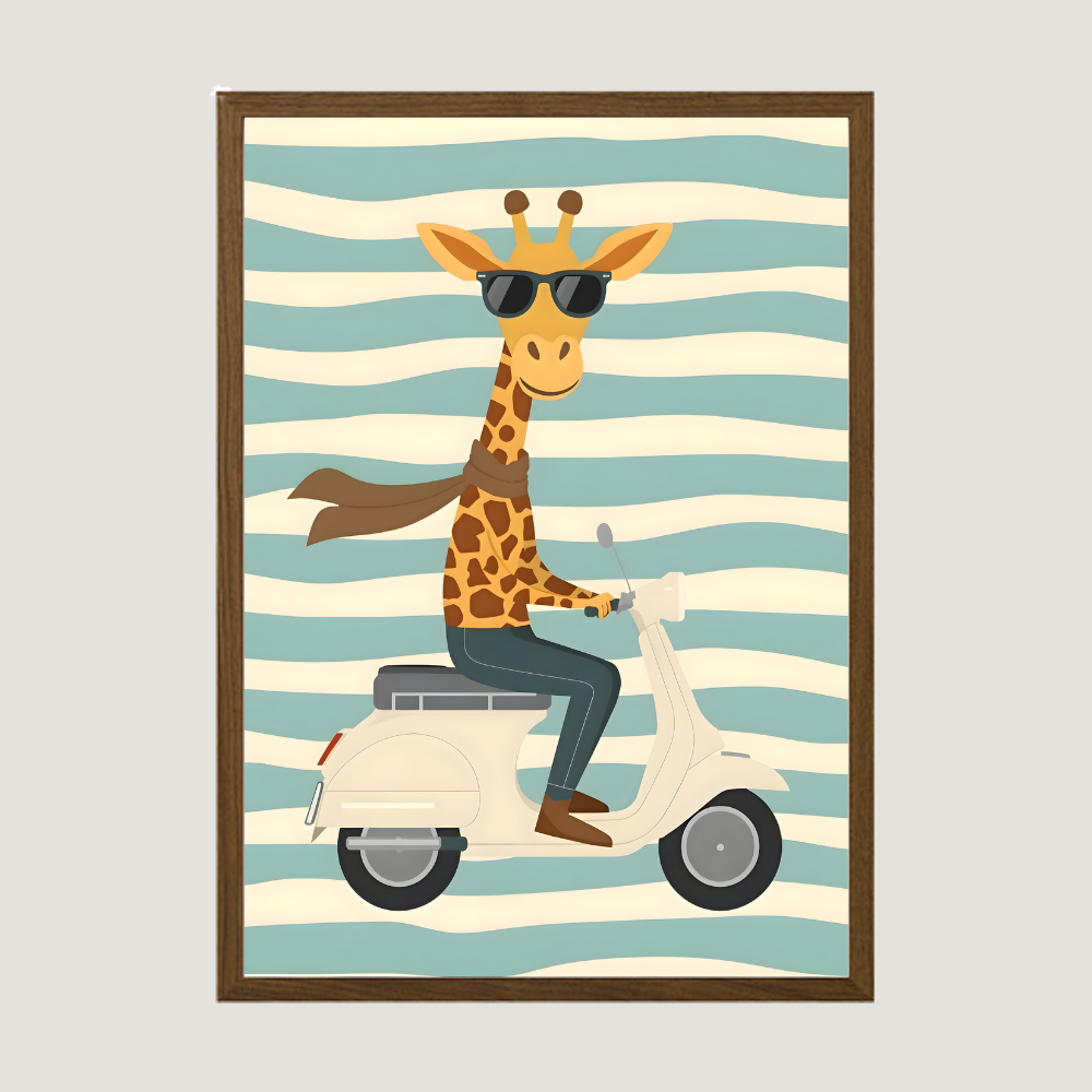 Gíraffi á hraðferð er skemmtileg mynd inn í barnaherbergið. Gíraffinn er sultuslakur töffari með sólgleraugu og trefil og setur einstakan svip á rýmið.